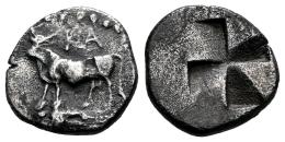 Bithynia. Kalchedon. 1/4 Siglos. 340-320 BC. (SNG BM Black Sea-124). (Hgc-7, 519). Anv.: Bull standing left on grain ear, KA above; all within pelleted circular border. Rev.: Quadripartite incuse square of mill sail pattern. Ag. 1,03 g. VF. Est...50,00.