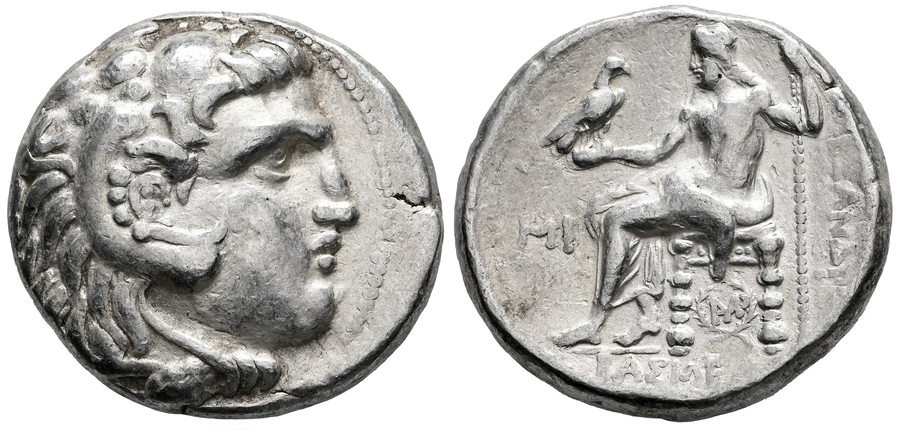 Seleukid Kingdom. Seleukos I Nikator. Tetradrachm. 311-300 BC. Babylon. In the name and types of Alexander III of Macedon. (Price-3751). (SC-82.4a). (Müller-735). Anv.: Head of Herakles to right, wearing lion skin headdress. Rev.: Zeus Aëtophoros seated to left, holding sceptre; BAΣIΛEΩΣ below, AΛEΞANΔPOY to right, MI in left field, monogram within wreath below throne. Ag. 17,03 g. Ex Classical Numismatic Group 560 (17/04/2024), lot 191. Included original label. VF. Est...220,00.