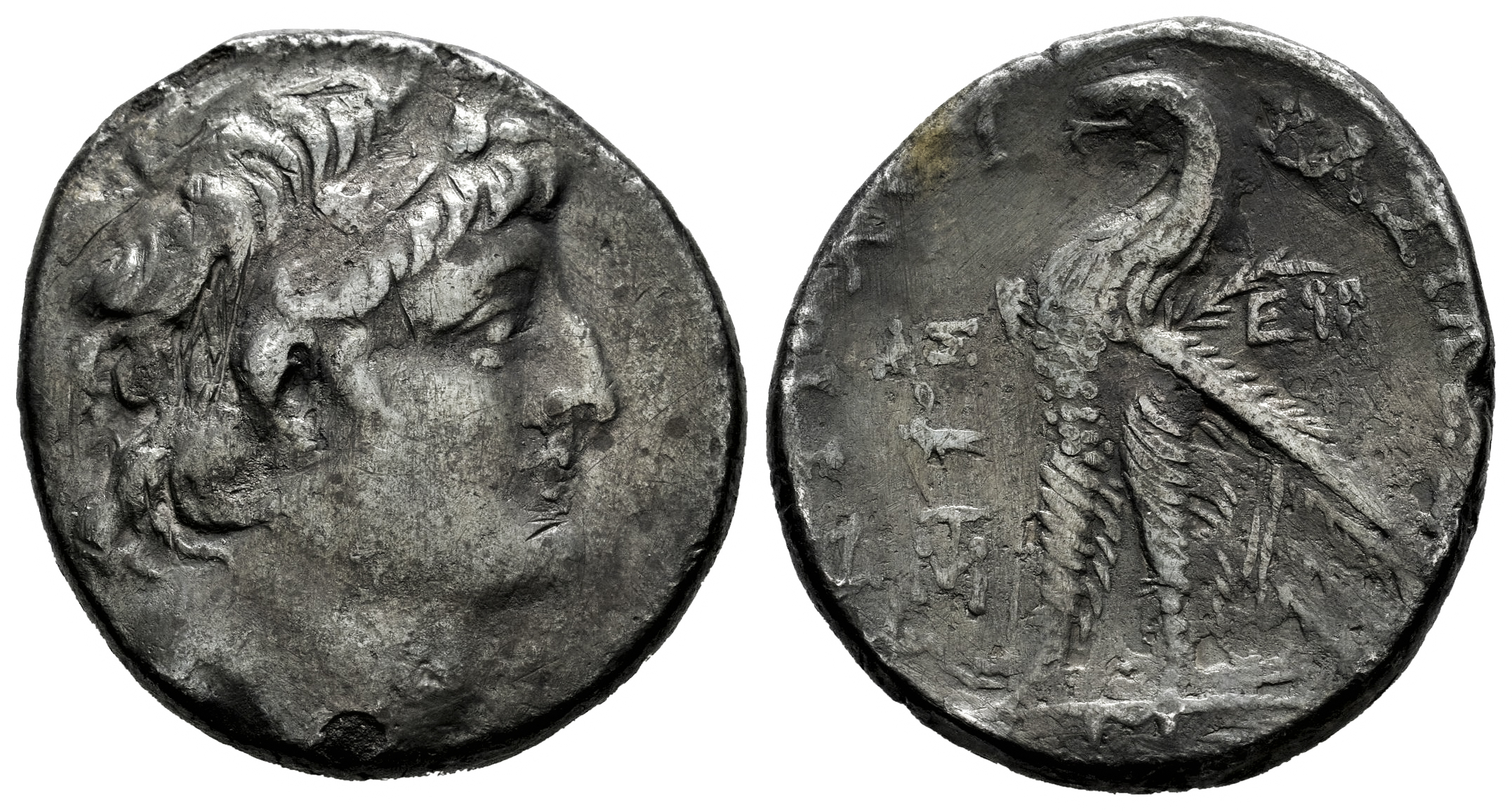 Seleukid Kingdom. Antiochos VIII Epiphanes (Grypos). Tetradrachm. SE 194 = 119/8 BC. Askalon. (SC-II 2339.3). (SNG Spaer-25982599). (DCA-272). Anv.: Diademed and draped bust of Antiochos VIII to right. Rev.: ΒΑΣΙΛΕΩΣ - ΑΝΤΙΟΧΟY Eagle, wings closed, standing left; behind, palm frond; in field to left, AΣ above dove standing left above monogram; to right, ΔϘΡ. Ag. 13,64 g. Patina. Scratches on obverse. Almost VF/Choice F. Est...200,00.