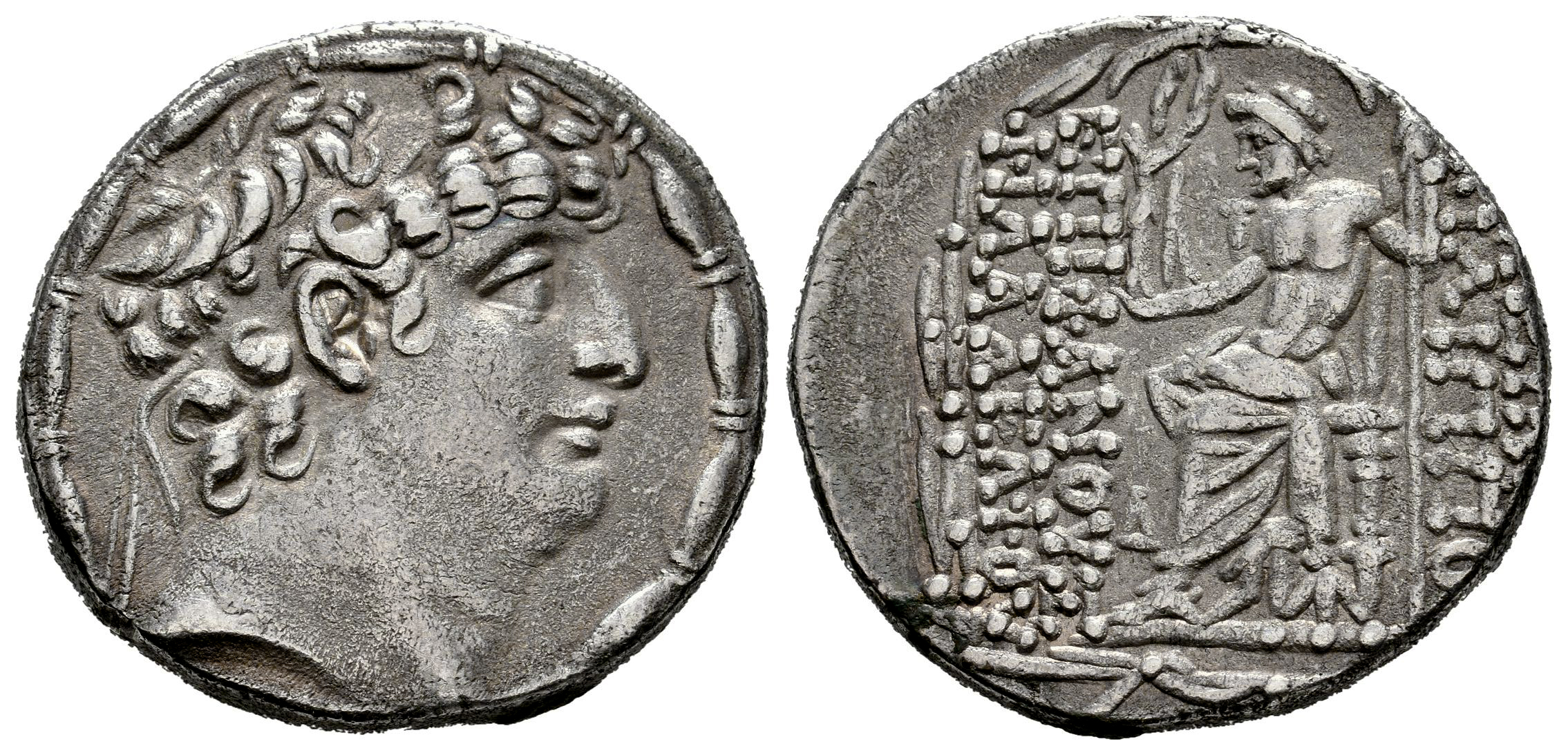 Seleukid Kingdom. Philip I Philadelphos. Tetradrachm. 88-75 BC. Antioch on the Orontes. (SC-2463.2a). (Hgc-9, 1319). (Tesorillo-Siria 19). Anv.: Diademed head to right. Rev.: Zeus Nikephoros seated to left on throne, holding sceptre; ΒΑΣΙΛΕΩΣ ΦΙΛΙΠΠΟY to right, ΕΠΙΦΑΝΟYΣ (ΦΙΛΑΔΕΛΦΟY) to left,monogram under throne. Ag. 15,70 g. Lightly displaced reverse. Choice VF/VF. Est...200,00.