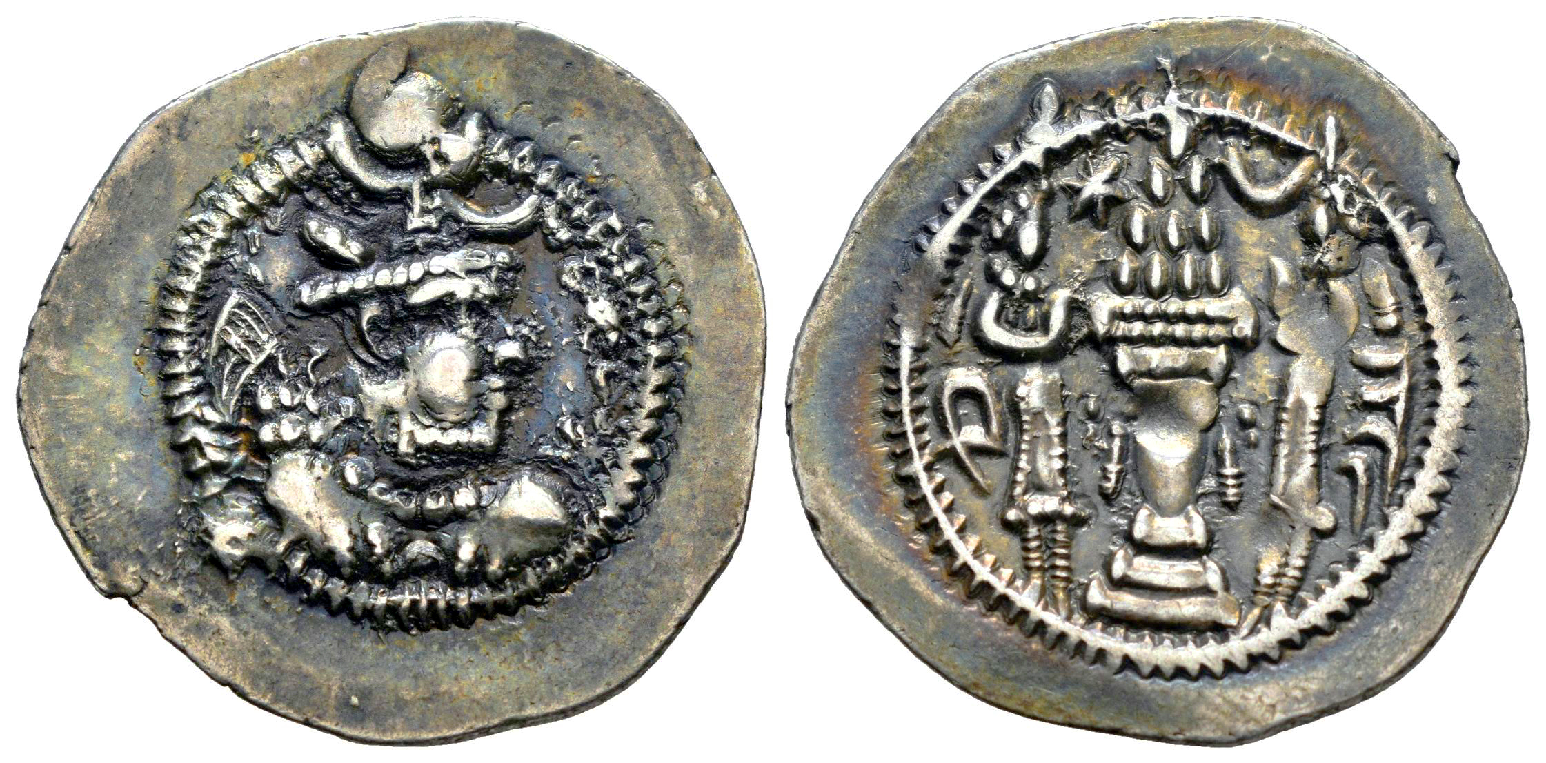 Sassanid Empire. Peroz I. Drachm. 457/9 - 484 AD. AS (Uncertain, possibly Khuzistan province). Second crown. (Göbl-II/3). Anv.: Crowned bust to right, crescent on forehead, korymbos set on crescent. Rev.: Fire altar with ribbons flanked by two attendants; mint signature to right, star and crescent flanking flames. Ag. 4,04 g. Delicate patina. Lightly toned. Rare. VF/Almost XF. Est...100,00.