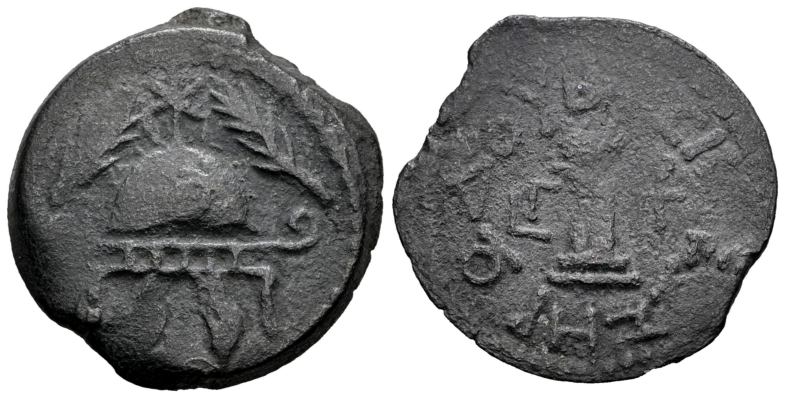 Judaea. Hasmoneans. Herodes I (The great). 8 Prutot. RY 3 = 40 BCE. Samaria (Sebaste?). (TJC-44). (Hendin-GBC 5, 1169). (RPC-I 4901). Anv.: Ornate helmet with tall crest topped by star; palm branches flanking. Rev.: Tripod; BAΣIΛEΩΣ HPOΔOY around, LΓ (date) to left, monogram to right; all within wreath. Ae. 5,39 g. VF. Est...180,00.
