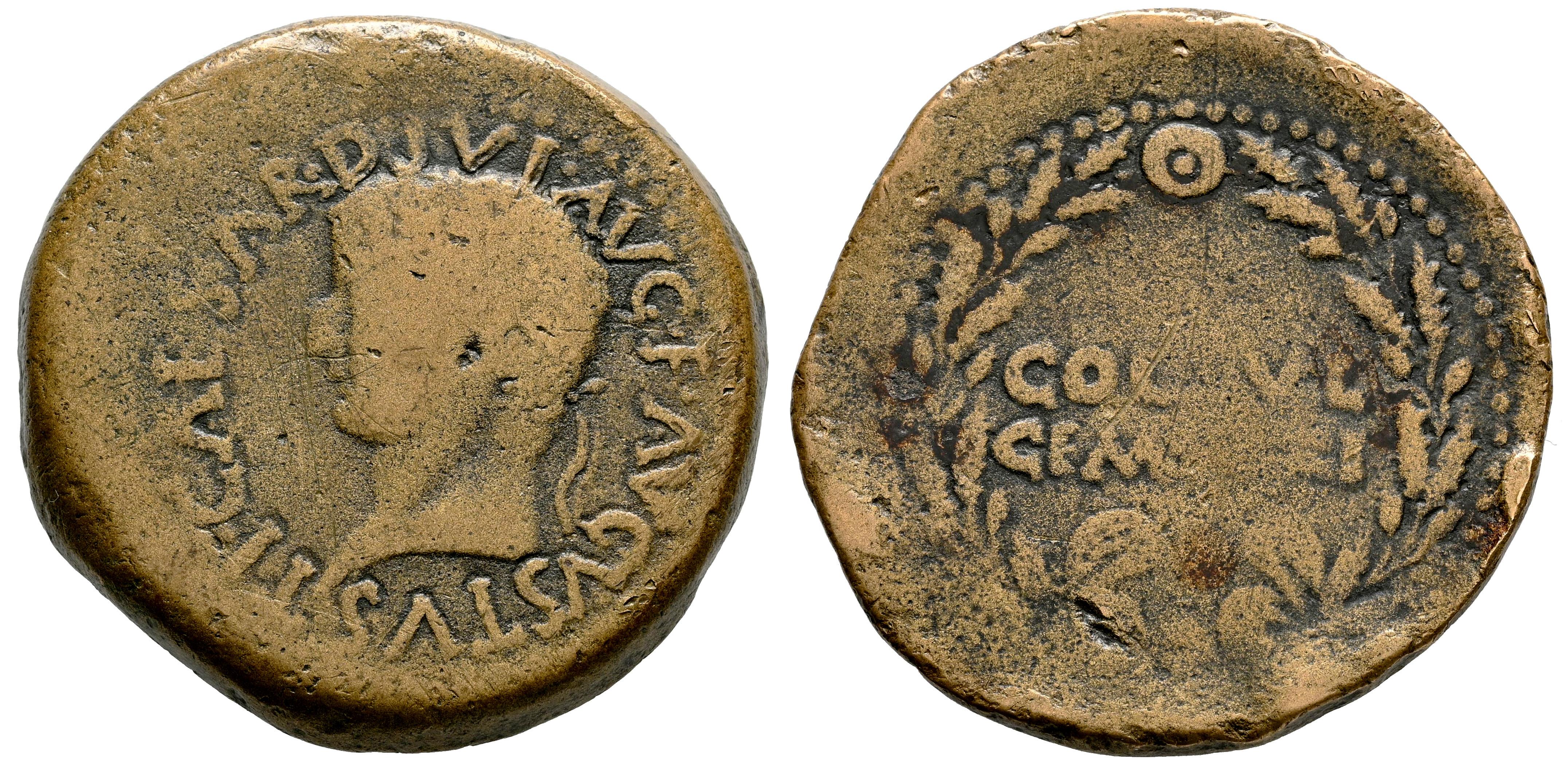 Acci. Time of Tiberius. Dupondius. 14-36 AC. Guadix (Granada). (Abh-38). (Acip-3006). Anv.: TI.CAE-SAR. DIVI. AVG. F. AVGVSTVS. Laureate head of Tiberius left. Rev.: COL. IVG. GEM. ACCI within laureal wreath. Ae. 26,25 g. Hairlines. Rare. Almost VF. Est...200,00.