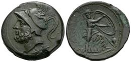 Bruttium. The Brettii. Didrachm. 214-208 BC. (Scheuch-38). (Sng Ans-94/95). (HN Italy-1987). Anv.: Head of Ares to left, wearing crested Corinthian helmet decorated with pegasos; thunderbolt below. Rev.: Hera Hoplosmia advancing to right, holding shield and spear; BPETTIΩN to left, grape bunch to right. Ae. 16,58 g. Rare in this condition. Ex Numis Antiques, Vcoins (06/05/2010); Ex Sternberg Auction XXXIII (1997), lot 3. Almost XF. Est...300,00.