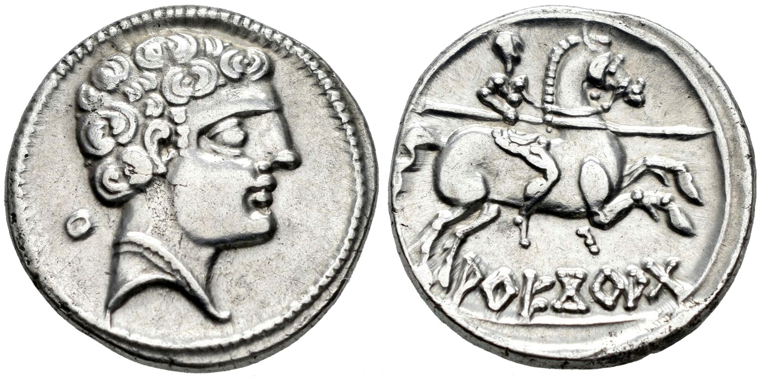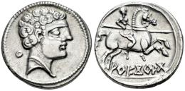 Areikoratikos-Arekoratas. Denarius. 150-20 BC. Agreda (Soria). (Abh-111). (MIB-102/24f). (Acip-1774). Anv.: Male head right, iberian letter KU behind. Rev.: Horseman right, holding spear (both feet visible), iberian legend AREKORATA below. Ag. 4,30 g. Very well-centered struck. Scarce in this grade. Almost XF. Est...300,00.