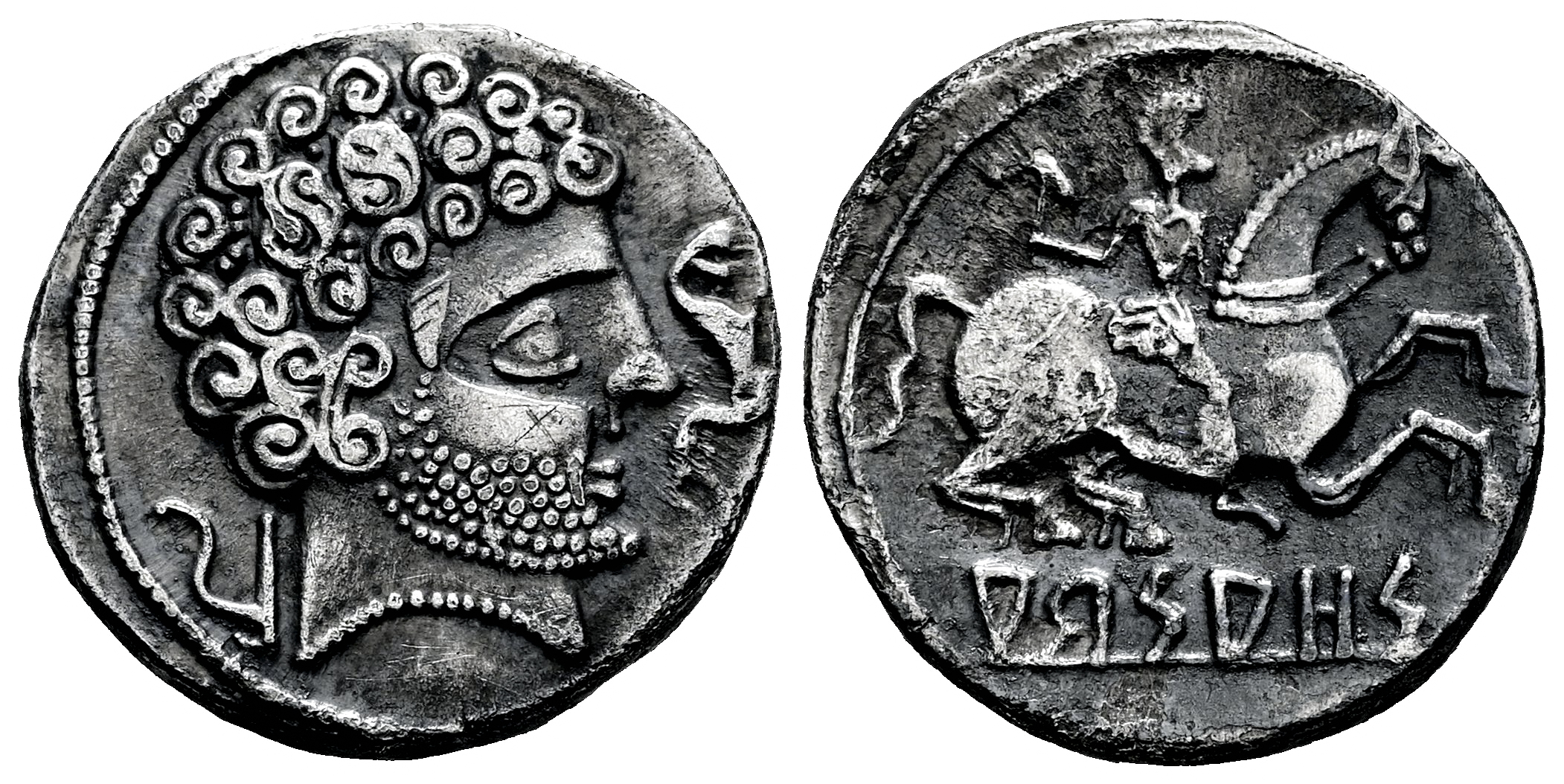 Arsaos. Denarius. 120-80 BC. Area of Navarra. (Abh-139). (Acip-1656). Anv.: Bearded male head right, dolphin before, plough behind. Rev.: Horseman right, holding bipennis, iberian legend ARSAOS. Ag. 3,79 g. Two S's in the hair. Sharply struck. Delicate patina. Almost XF/Choice VF. Est...500,00.