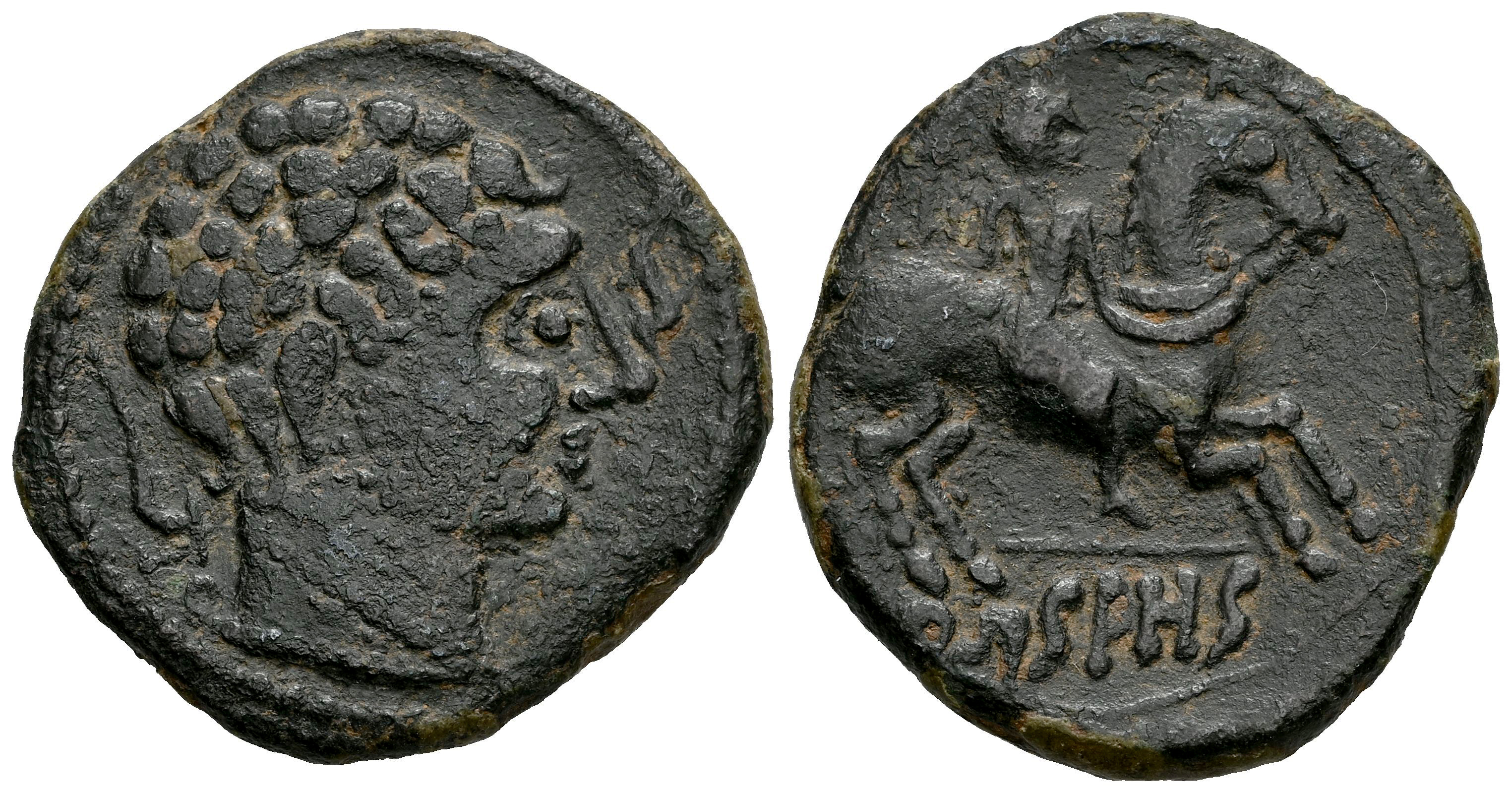 Arsaos. Unit. 120-80 BC. Area of Navarra. (Abh-145). (MIB-85/5a). (Acip-1644). Anv.: Bearded male head right, plough behind, dolphin before. Rev.: Horseman right, holding bipennis, iberian legend AЯSAOS, line above the toponym. Ae. 9,24 g. VF/Almost VF. Est...150,00.