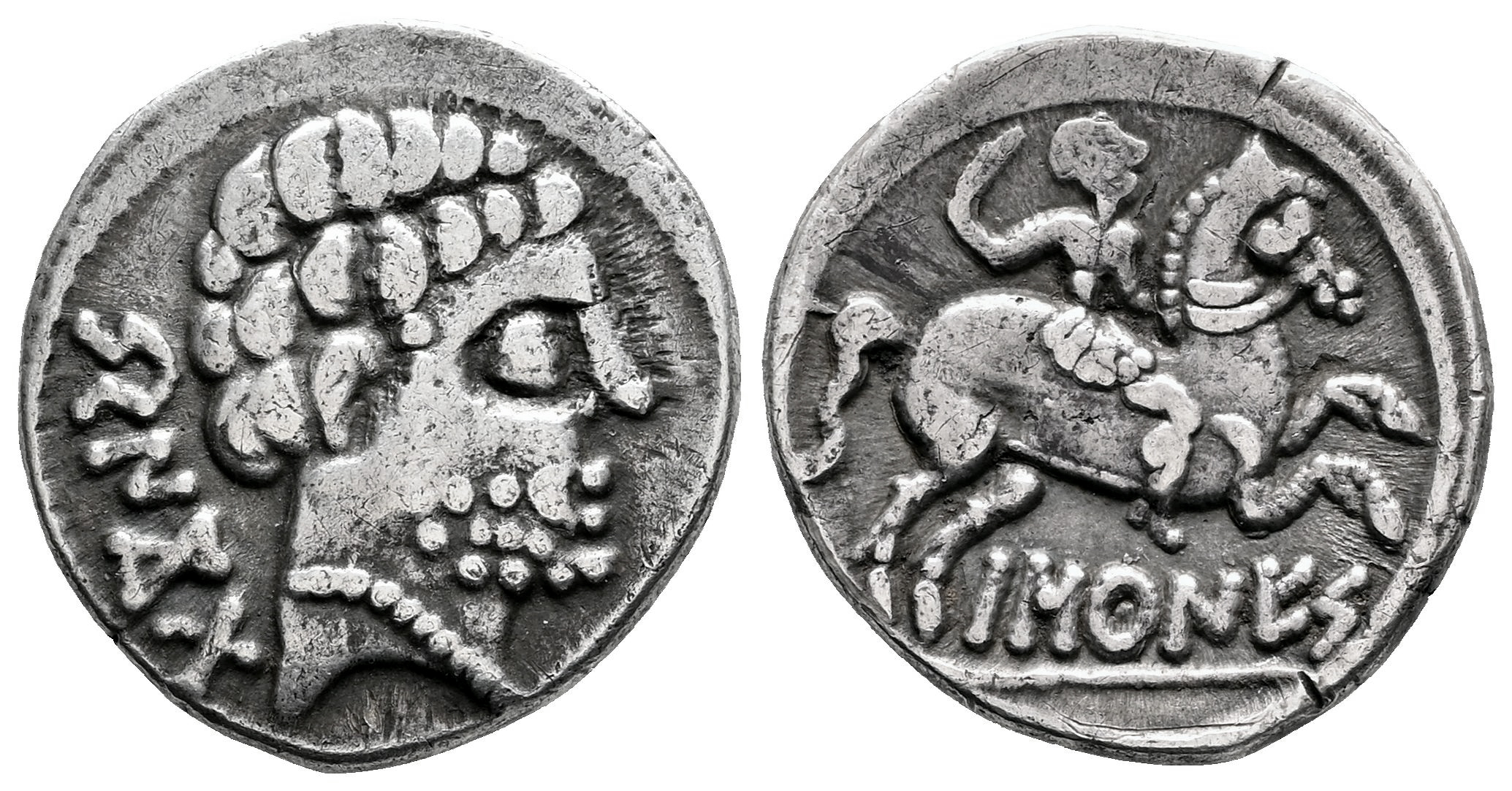 Baskunes-Barskunes. Denarius. 120-20 BC. Pamplona. (Abh-215). (Acip-1632). (C-10). Anv.: Bearded head right, iberian legend BENKODA behind. Rev.: Horseman right, holding sword, iberian legend BASKUNES below. Ag. 3,77 g. VF/Choice VF. Est...200,00.