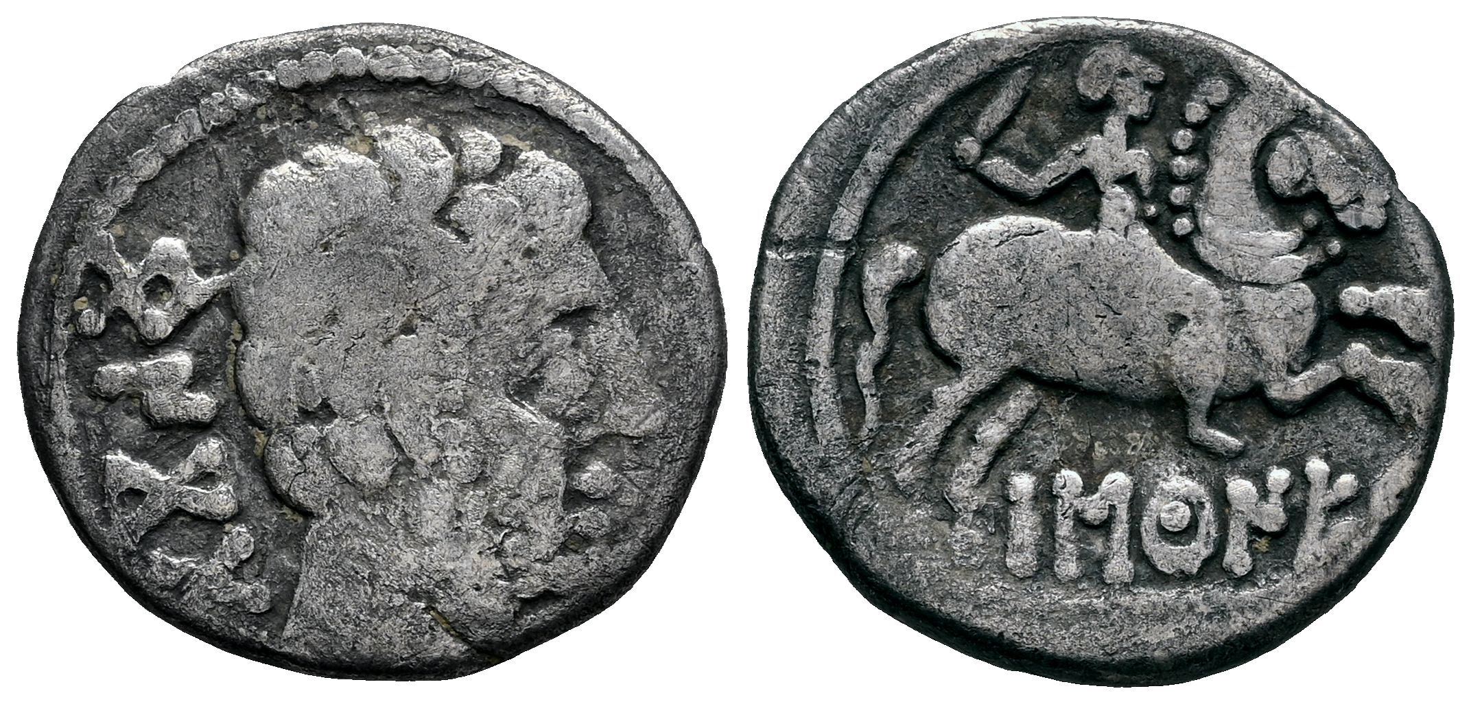 Baskunes-Barskunes. Denarius. 120-20 BC. Pamplona. (Abh-215). (MIB-87/14). (Acip-1630). Anv.: Bearded head right, iberian legend BENKODA behind. Rev.: Horseman right, holding sword, iberian legend BASKUNES below. Ag. 2,97 g. Choice F/Almost VF. Est...90,00.