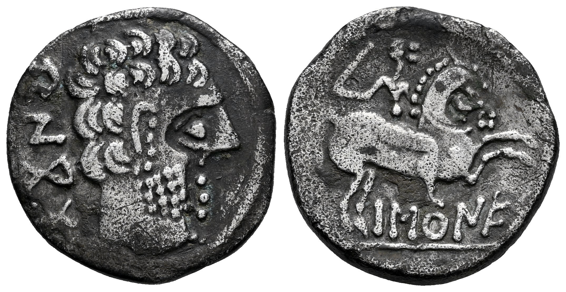 Baskunes-Barskunes. Denarius. 120-20 BC. Pamplona. (Abh-215). (MIB-87/18 /= ID 54073). Anv.: Bearded head right, iberian legend BENKODA behind. Rev.: Horseman right, holding sword, iberian legend BASKUNES below. Ag. 3,67 g. Gallic counterfeit. Rare. VF. Est...200,00.