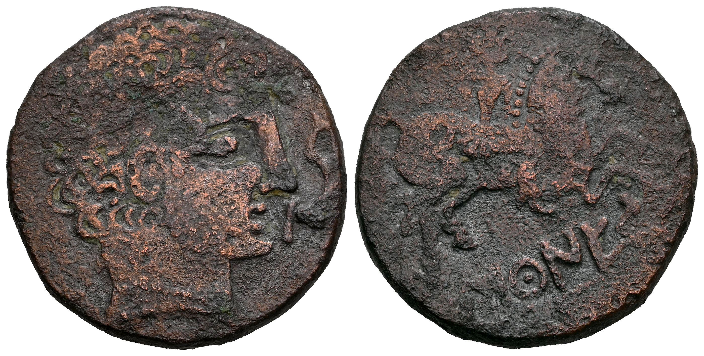 Baskunes-Barskunes. Unit. 120-20 BC. Pamplona. (Abh-227). (MIB-87/05b). Anv.: Bearded head right, dolphin before. Rev.: Horseman right, holding sword, curved legend BARSKUNEƧ on line. Ae. 8,13 g. Barbarous style. Rare. Choice F. Est...70,00.