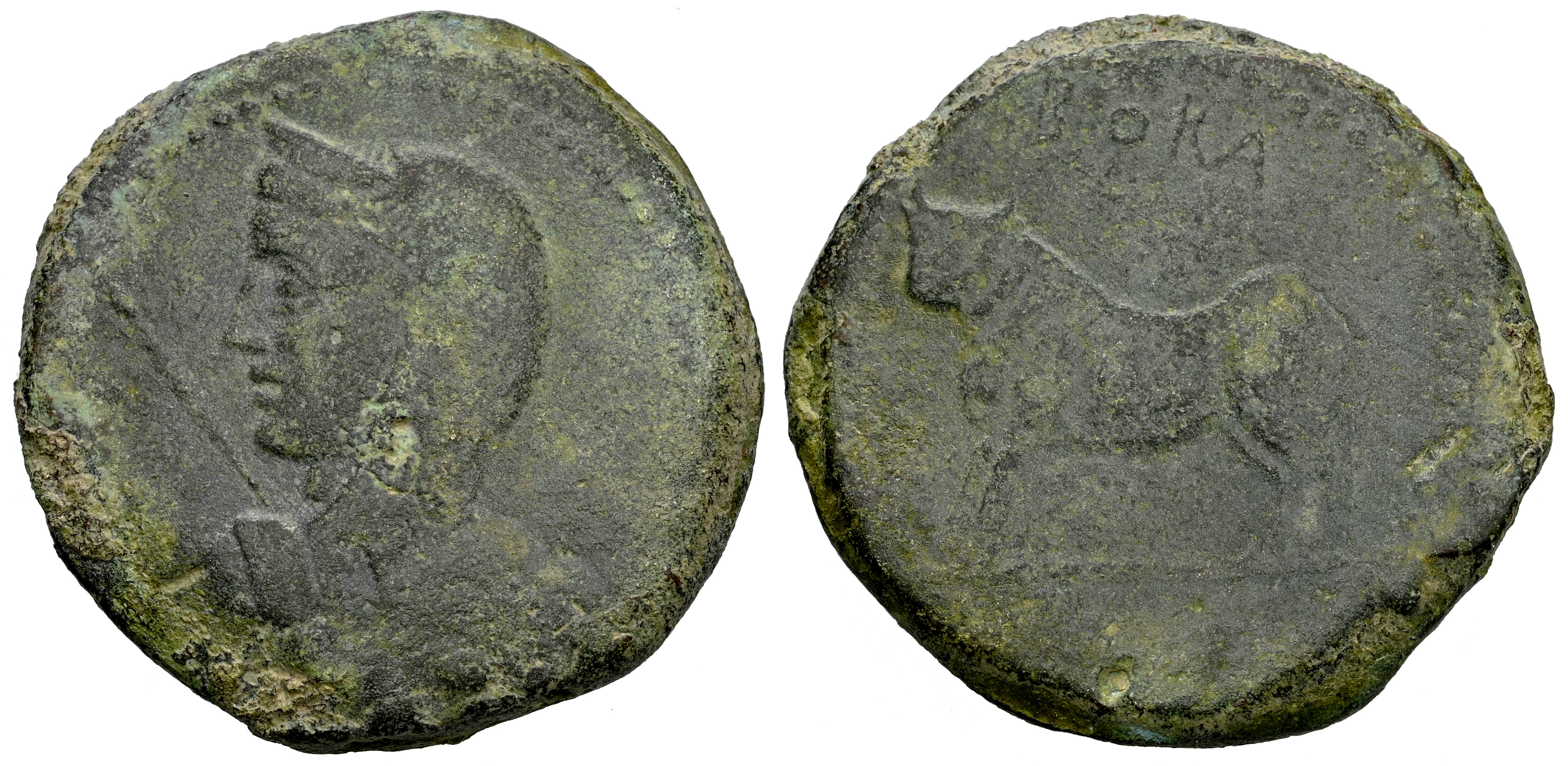 Bora. Unit. 100-50 BC. Alcaudete (Jaén). (Abh-290). (MIB-203/1). (Acip-2309). Anv.: Female bust left, scepter before. Rev.: Bull left on line, BORA above. Ae. 26,58 g. VF. Est...220,00.