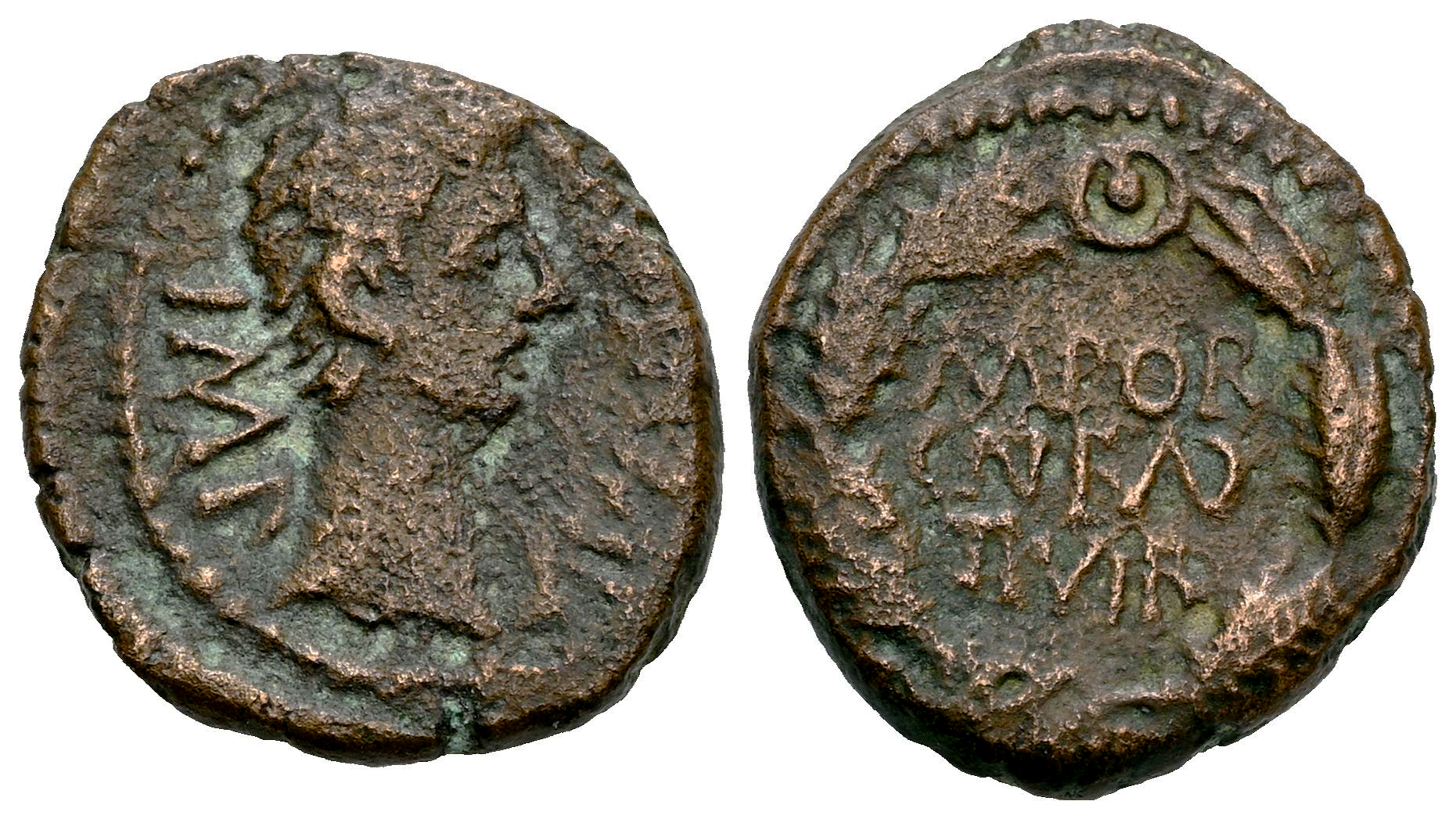 Caesaraugusta. Augustus period. Cuadrante. 27 BC - 14 AD. Zaragoza. (Abh-341). Anv.: AVGVSTVS. IMP. Bare head of Augustus right. Rev.: M. POR. CN. FAD. II. VIR within laurel wreath. Ae. 3,28 g. Almost VF/VF. Est...70,00.