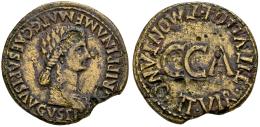 Caesaraugusta. Time of Caligula. Unit. 37-41 AD. Zaragoza. (Abh-393). (Rpc-I 385). Anv.: AGRIPPINA. M. E MAT. G. CAESARIS. AVGVSTI. Head of Agrippina right. Rev.: In the center,C. C. A., legend TITVLLO. ET. MONTANO around. Ae. 11,25 g. Rust. Tooled and smoothed. Very rare. VF. Est...200,00.