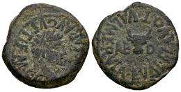 Calagurris. Time of Tiberius. Half unit. 14 - 36 BC. Calahorra (La Rioja). (Abh-431). (Acip-3129). Anv.: (TI. CAE)SAR. AVGVST. F. M. C. I. Laureate head of Tiberius right. Rev.: Bull's head facing, AE-D on the sides, L. VAL. FLAVO. T. VAL. MERVLA around. Ae. 5,80 g. Choice F. Est...50,00.