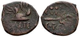 Carteia. Cuadrante. 80-20 BC. San Roque (Cadiz). (Abh-658). (MIB-200/39a). (Acip-2589). Anv.: Petasus, CARTE below. Rev.: Caduceus, legend C.P.E., retrograde CARTE and three pellets. Ae. 1,80 g. A few specimens known. Of the highest rarity. Almost VF. Est...300,00.