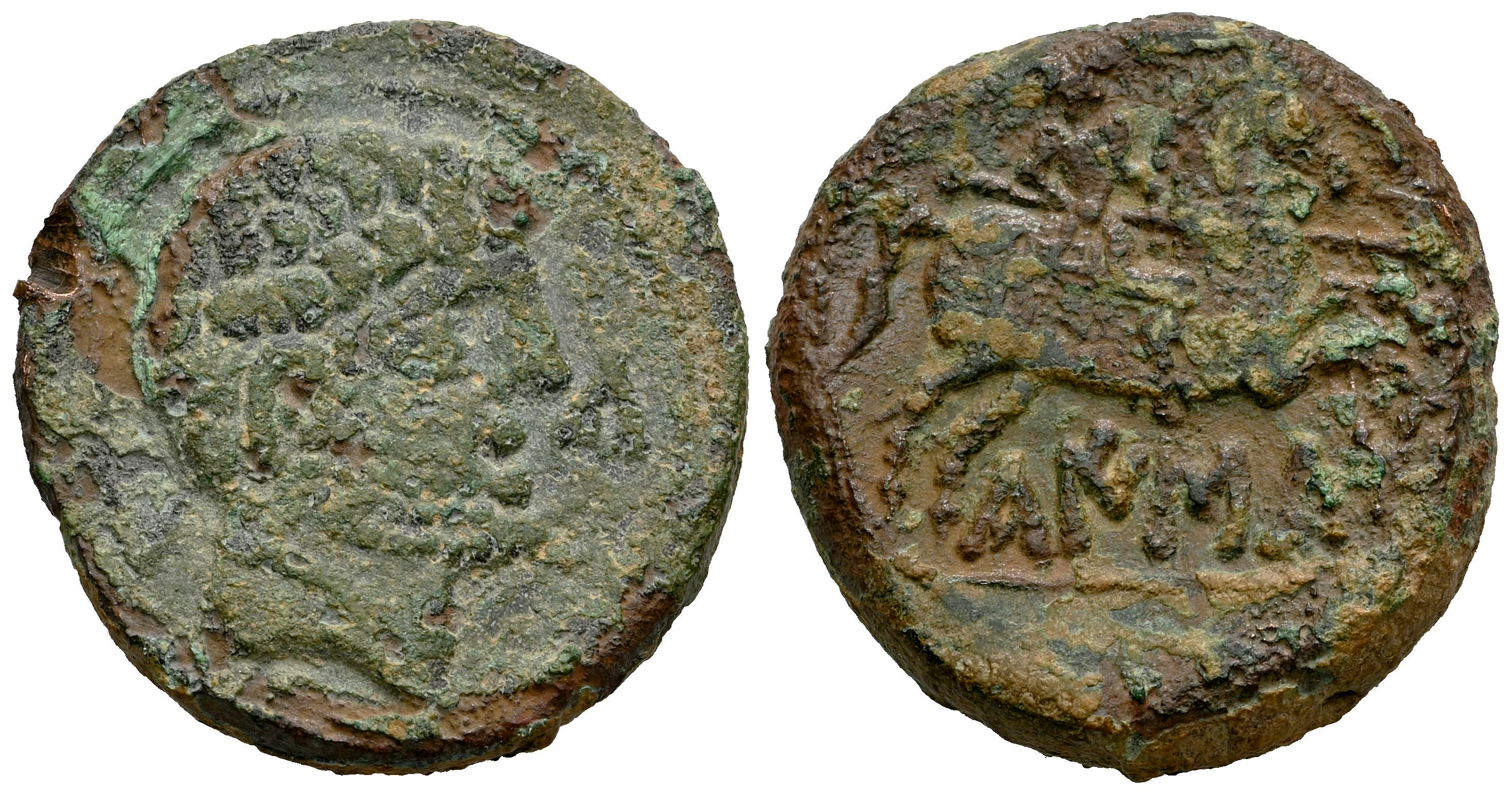 Kaiskata. Unit. 120-20 BC. Cascante (Navarra). (Abh-687). (MIB-103/2). (Acip-1682). Anv.: Bearded head right, iberian letter KA before, plough behind. Rev.: Horseman right, holding spear, iberian legend KAISKATA below. Ae. 13,57 g. Rough patina. Knock on edge. Almost VF. Est...150,00.