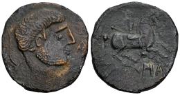 Kaiskata. Unit. 120-20 BC. Cascante (Navarra). (Abh-687). (MIB-103/1). (Acip-1681). Anv.: Bearded head right, iberian letter KA before, plough behind. Rev.: Horseman right, holding spear, iberian legend KAISKATA below. Ae. 8,18 g. Rare. VF. Est...150,00.