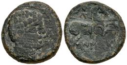Kaiskata. Unit. 120-20 BC. Cascante (Navarra). (Abh-687). (Acip-1682). Anv.: Bearded head right, iberian letter KA before, plough behind. Rev.: Horseman right, holding spear, iberian legend KAISKATA below. Ae. 10,51 g. Almost VF. Est...150,00.