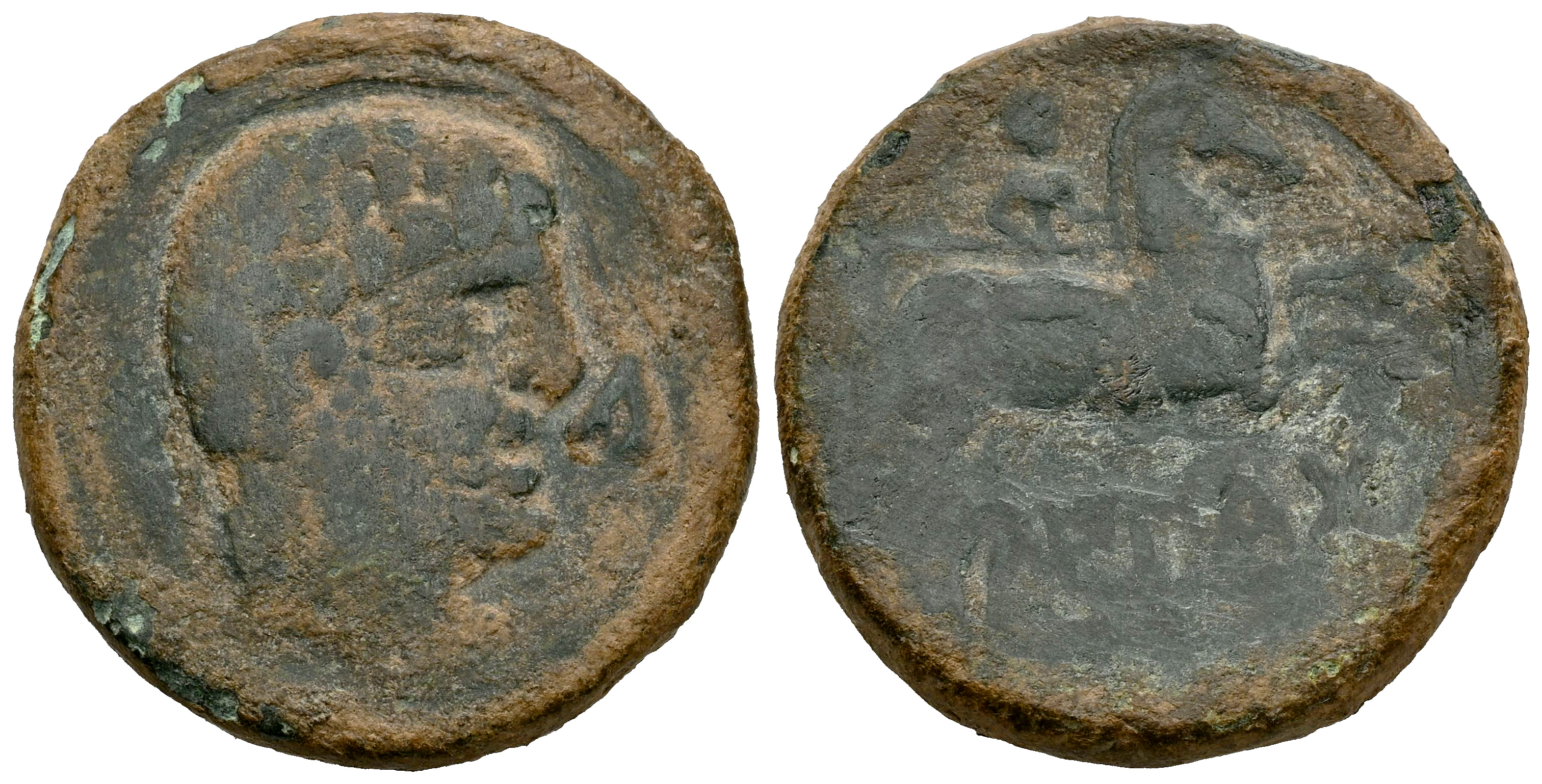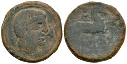Kaiskata. Unit. 120-20 BC. Cascante (Navarra). (Abh-687). (Acip-1682). Anv.: Bearded head right, iberian letter KA before, plough behind. Rev.: Horseman right, holding spear, iberian legend KAISKATA below. Ae. 12,62 g. Choice F. Est...120,00.
