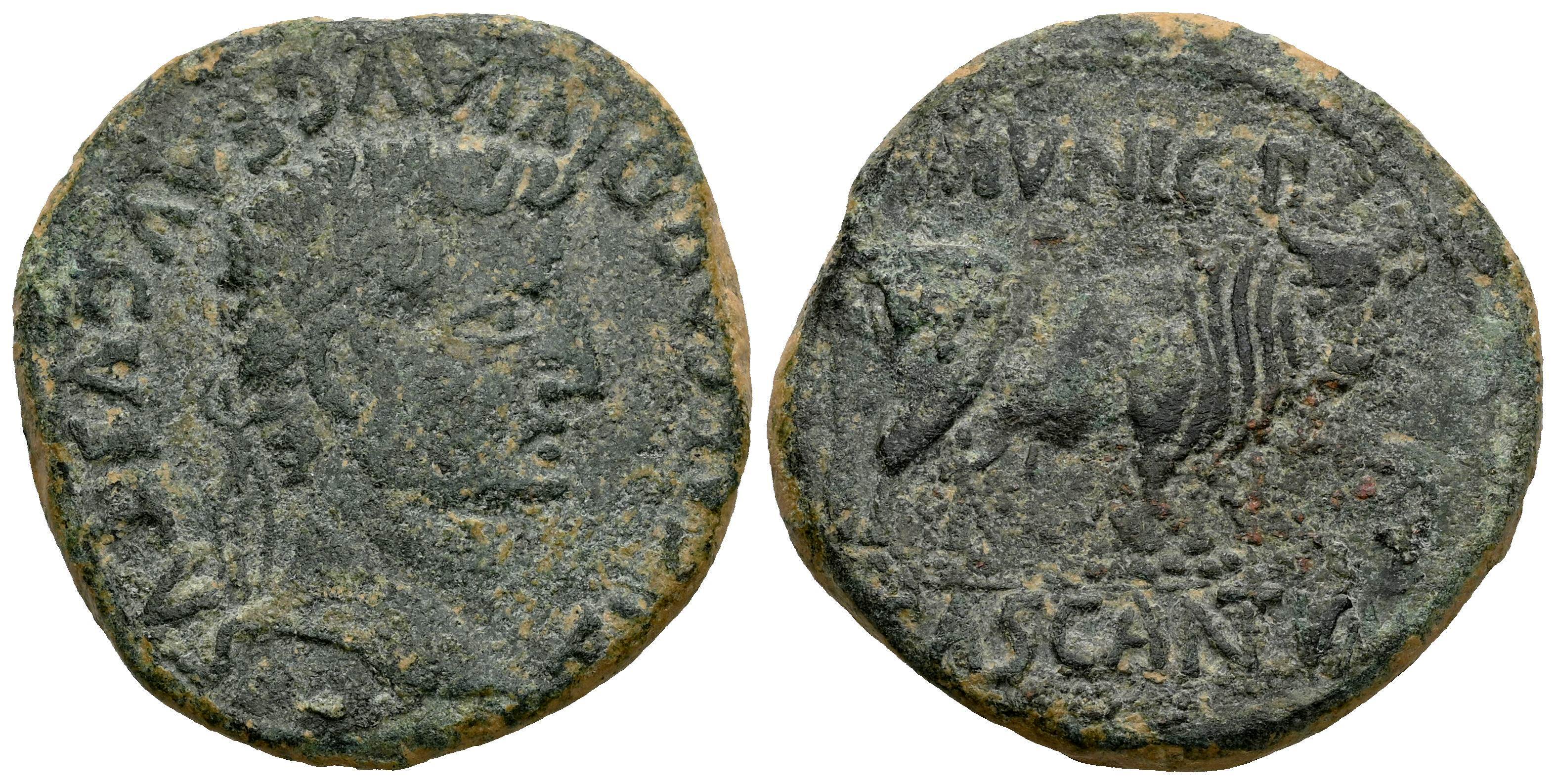 Cascantum. Time of Tiberius. Unit. 14-36 AD. Cascante (Navarra). (Abh-690). (Acip-3159). Anv.: TI. CAESAR. DIVI. AVG. F. AVGVSTVS. Laureate head of Tiberius right. Rev.: Bull right, MVNICIP above, CASCANTVM. below, N and T interlace. Ae. 12,49 g. Almost VF. Est...70,00.