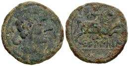 Kueliokos. Unit. 120-20 BC. High zone of Ebro. (Abh-870). (MIB-91/4). (Acip-1690). Anv.: Beardless head right between dolphins and iberian letter KU. Rev.: Horseman right, holding palm, iberian legend KUELIOKOS in exergue. Ae. 9,11 g. Rust on reverse. Very scarce. Choice F. Est...110,00.