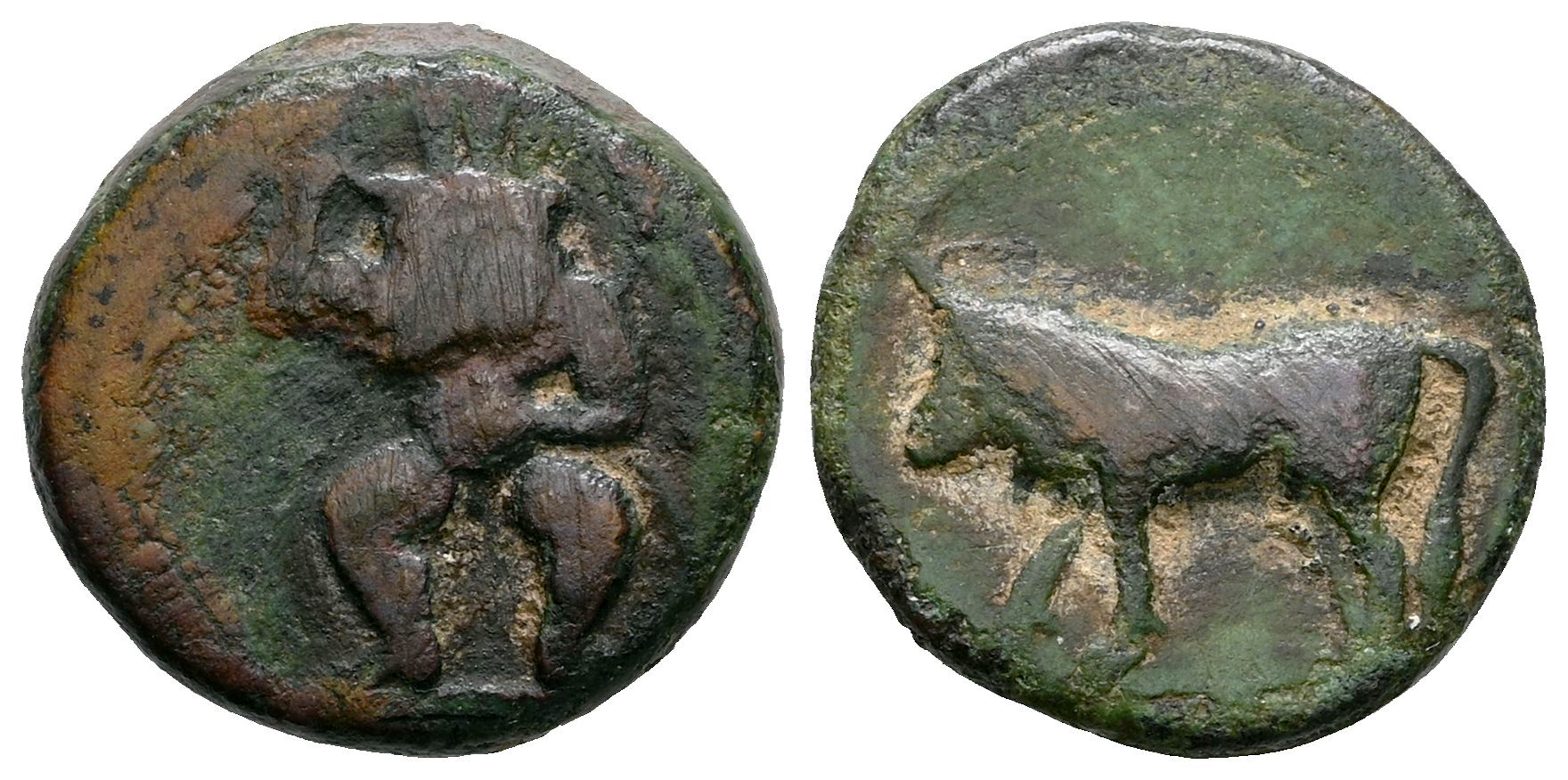 Ebusus. 1/4 calco. 300-200 BC. Ibiza. (Abh-904). (MIB-16/06a). (Acip-701). Anv.: Bes, holding mace and snake. Rev.: Bull left. Ae. 3,03 g. Almost VF/VF. Est...80,00.