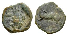 Ebusus. 1/8 calco. 200-100 BC. Ibiza. (Abh-Unlisted). (MIB-15078. 16/22). (Acip-Unlisted). Anv.: Bes wearing skirt, holding mace and snake, on the left the letter 'Aleph'. Rev.: Bull charging right. Ae. 0,92 g. Very rare. A few specimens known. VF. Est...100,00.