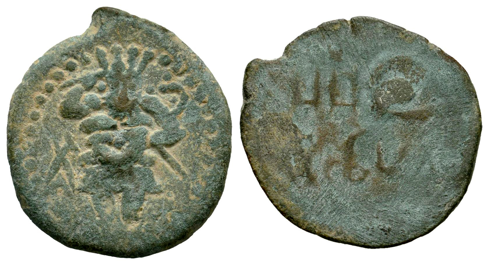 Ebusus. Half unit. 20 BC. Ibiza. (Abh-946). (MIB-16/73a). (Acip-757). Anv.: Bes holding mace and snake, punic letter alef left. Rev.: Punic legend. Ae. 3,67 g. VF/Almost VF. Est...80,00.