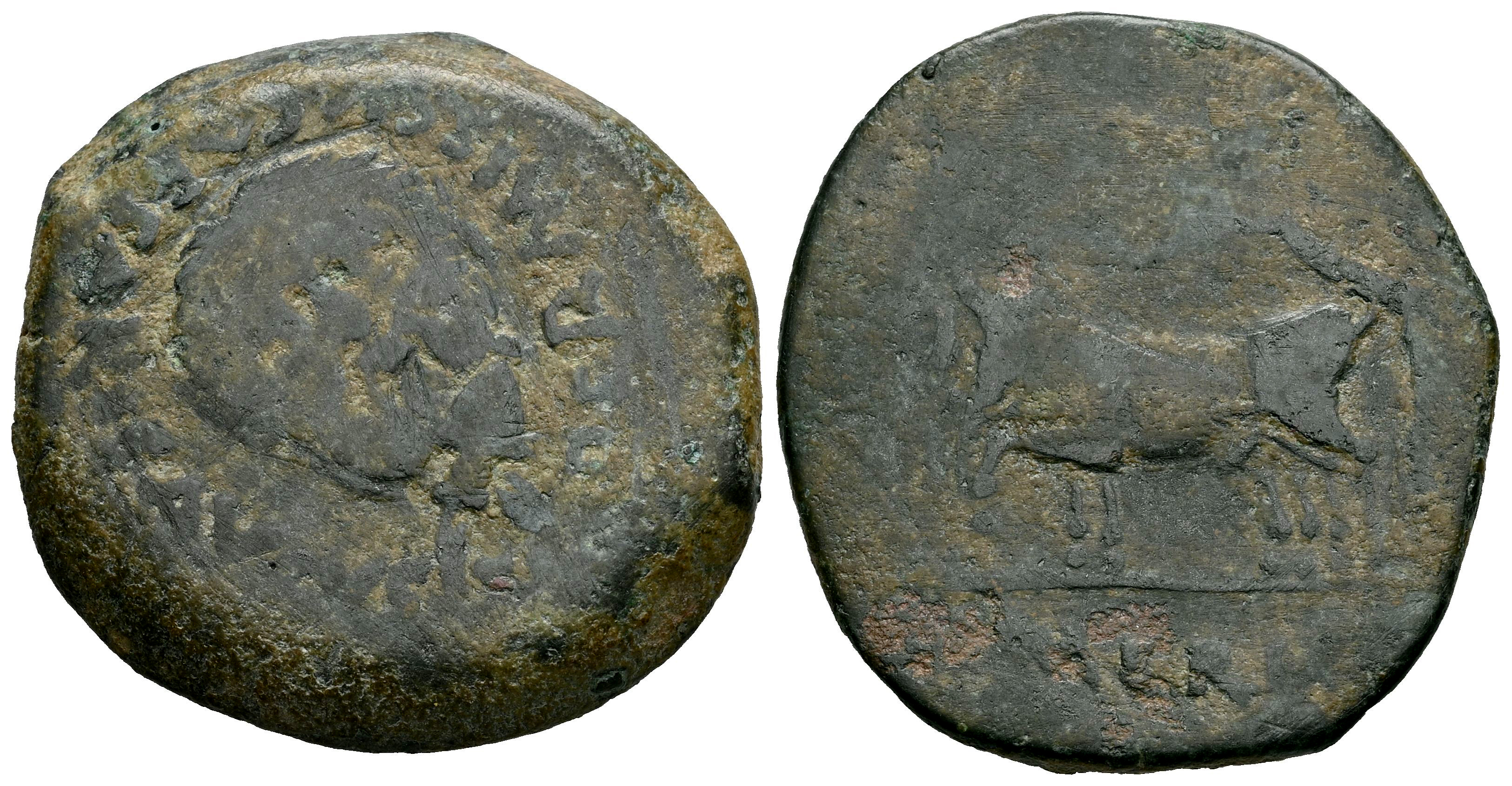Emerita Augusta. Augustus period. Unit. 22 BC - 14 AD. Mérida (Badajoz). (Abh-1009). (Acip-3373a). Anv.: PERMISSV. CAESARIS. AVGVSTI. Facing bearded head, amphora before. Rev.: Pair of oxen left, (AVGVSTA) above, (E)MERI(TA) below. Ae. 13,67 g. Choice F/F. Est...50,00.