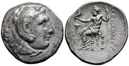 Aeolis. Kyme. Tetradrachm. 215-200 BC. In the name and types of Alexander III of Macedon. (Mektipini-254 var. monogram). Anv.: Head of Herakles to right, wearing lion skin headdress. Rev.: Zeus Aëtophoros seated to left, holding sceptre; AΛEΞANΔPOY to right, one-handed jug above monogram in left field. Ag. 16,51 g. Ex Classical Numismatic Group 565 (03/07/2024), lot 96; Ex Richard Ashton Collection; Classical Numismatic Group 391 (15/02/2017), lot 213. Included original label. VF. Est...200,00.