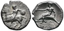 Calabria. Tarentum. Nomos. 380-340 BC. (Vlasto-428). (HN Italy-876). (Sng Cop-814). Anv.: Horse galloping to left, rider dismounting, holding shield below, Π. Rev.: Oecist riding dolphin to left, his right hand out stretched below, A; TAPAΣ below. Ag. 7,52 g. Ex Bertolami Fine Arts 16 (17/06/2015), lot 27. Choice VF/Almost XF. Est...250,00.