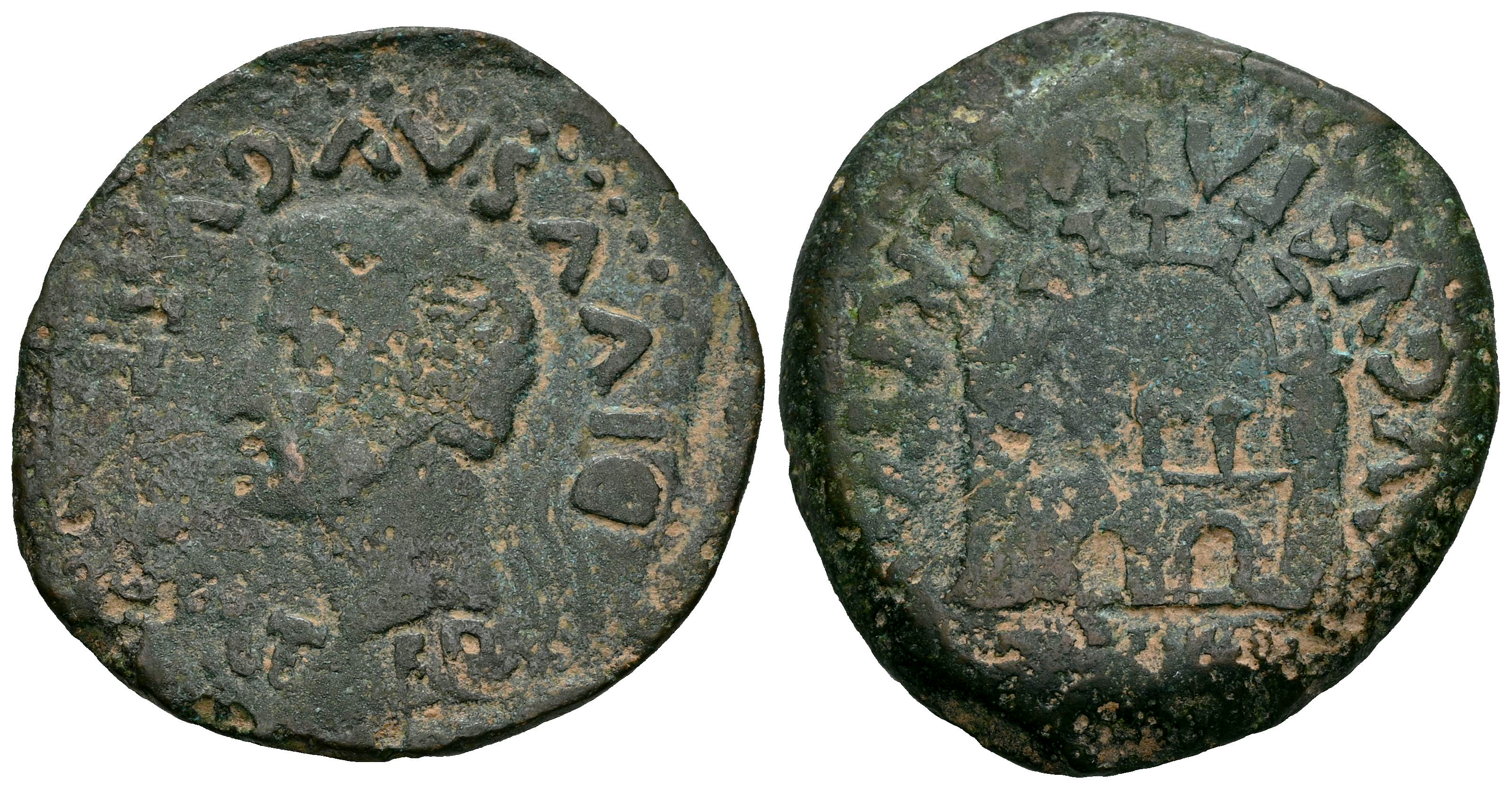 Emerita Augusta. Time of Tiberius. Unit. 14-36 AD. Mérida (Badajoz). (Abh-1044). Anv.: DIVVS. AVGVST(VS. P)ATER. Radiate head of Augustus left. Rev.: City gate, COL. AVGVSTA. EMERITA around. Ae. 10,28 g. Choice F. Est...60,00.