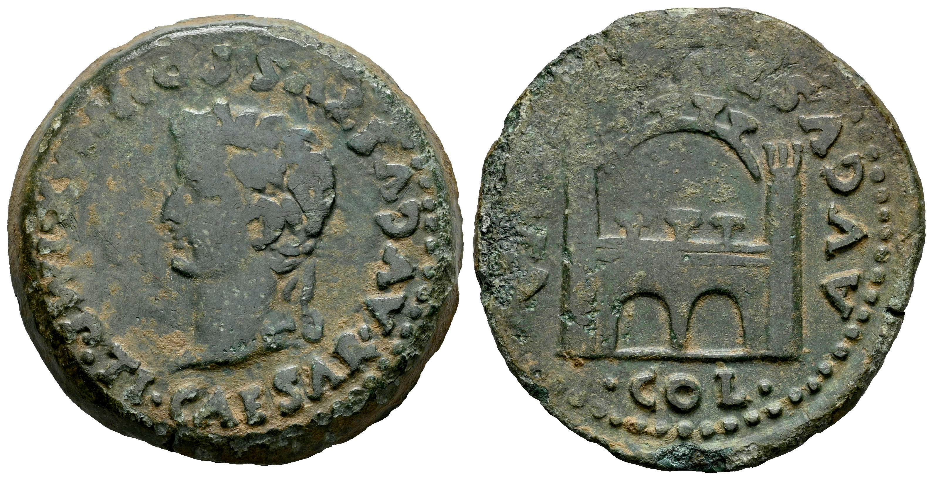 Emerita Augusta. Time of Tiberius. Unit. 14-36 AD. Mérida (Badajoz). (Abh-1056). (Acip-3408e). Anv.: TI. CAESAR. AVGVSTVS. PON. MAX. IMP. Laureate head of Tiberius left. Rev.: City gate, COL. AVGVSTA. (EMERI)TA around. Ae. 12,73 g. Almost VF/VF. Est...90,00.