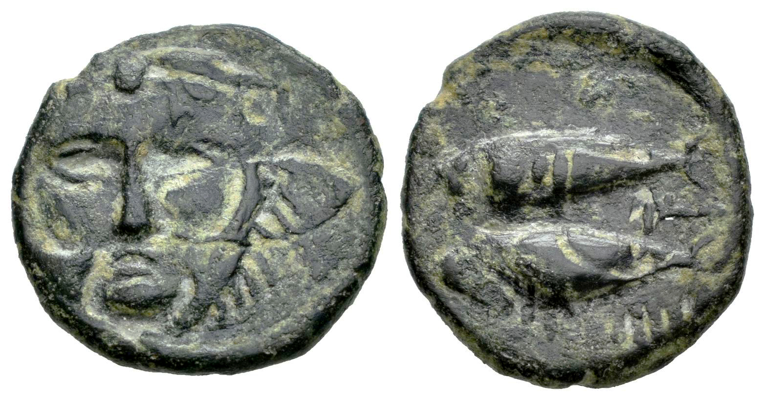 Gades-Gadir. Chalkous. 200-100 BC. Cadiz. (Abh-1336). (MIB-9/33). (Acip-655). Anv.: Facing head of Melkart, with lion skin. Rev.: Two tunny left, phoenician letter alef in between. Ae. 3,96 g. Double strike, obverse on reverse and vice versa. Choice VF. Est...150,00.