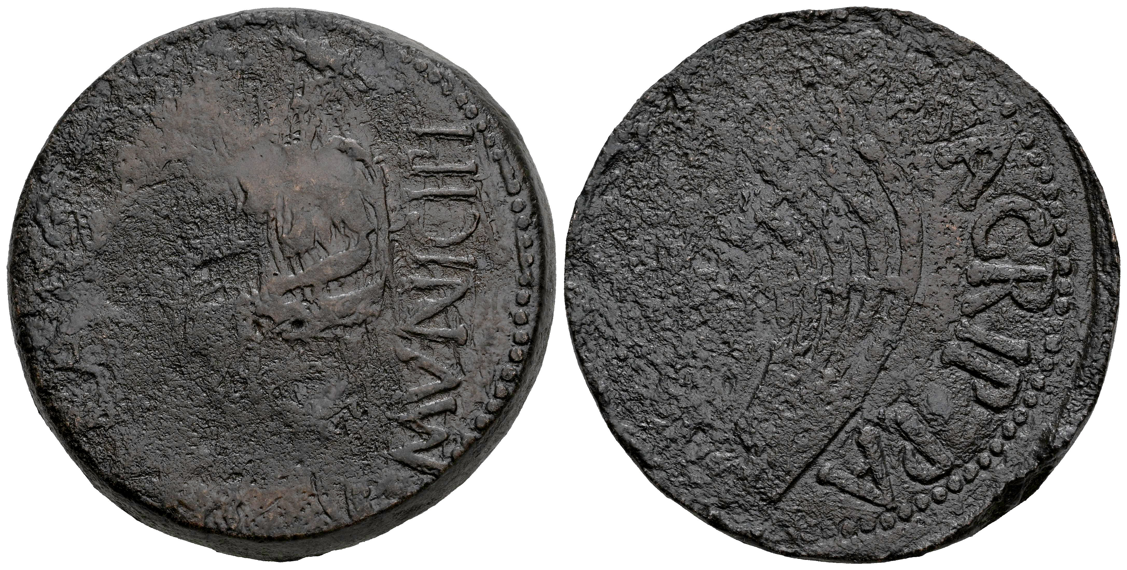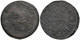 Gades-Gadir. Augustus period. Sestertius. 27 BC - 14 AD. Cadiz. (Abh-1359). Anv.: (PARENS). MVNICIP. Agrippa seated left. Rev.: Acrostolium right, (M). AGRIPPA. (COS. III) around. Ae. 39,23 g. Cleaned. Very rare. F. Est...400,00.