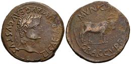 Graccurris. Time of Tiberius. Unit. 14-36 AD. Alfaro (La Rioja). (Abh-1391). (Acip-3196). Anv.: TI. CAESAR. DIVI. AVG. F. AVGVSTVS. Laureate head of Tiberius right. Rev.: Mitred bull standing right, MVNICIP above, GRACCVRRIS below. Ae. 12,24 g. Scarce. VF/Almost VF. Est...120,00.