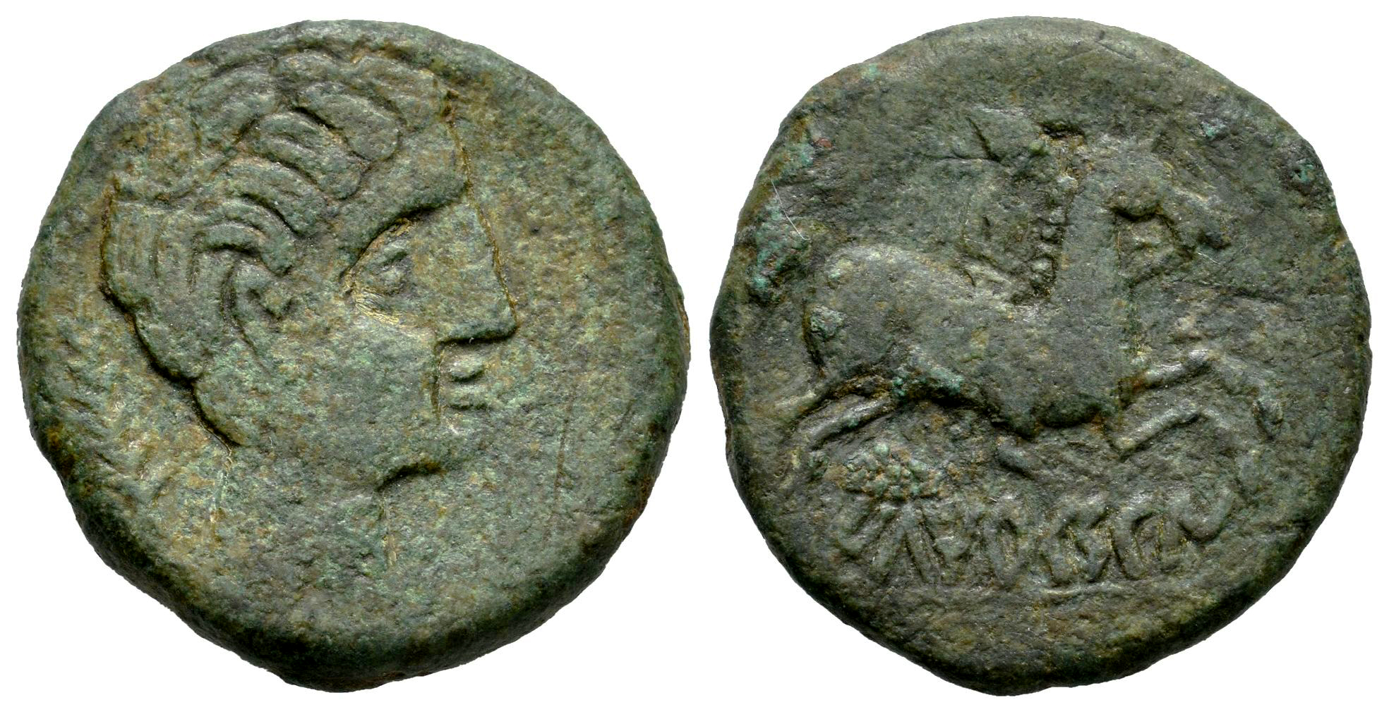 Iltirkesken. Unit. 120-20 BC. Area of Solsona. (Abh-1448). (Acip-1399). (C-16). Anv.: Male head right, ear of corn behind. Rev.: Horseman right, holding palm, iberian legend ILTIRKESKEN below. Ae. 9,91 g. Serie semipesada. Almost VF. Est...70,00.