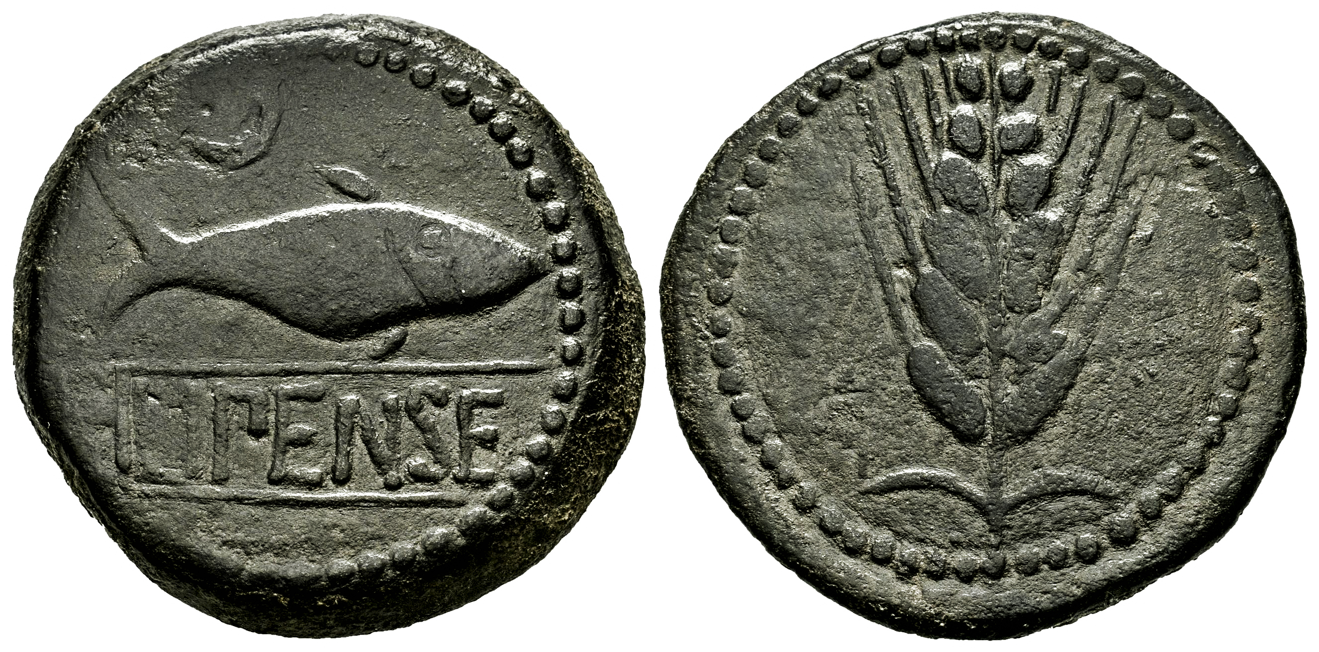 Ilipense. Unit. 120-20 BC. Alcalá del Río (Sevilla). (Abh-1531). (MIB-186/06). (Acip-2335). Anv.: Shad right, crescent above, legend ILIPENSE. Rev.: Ear of corn. Ae. 19,80 g. VF. Est...150,00.