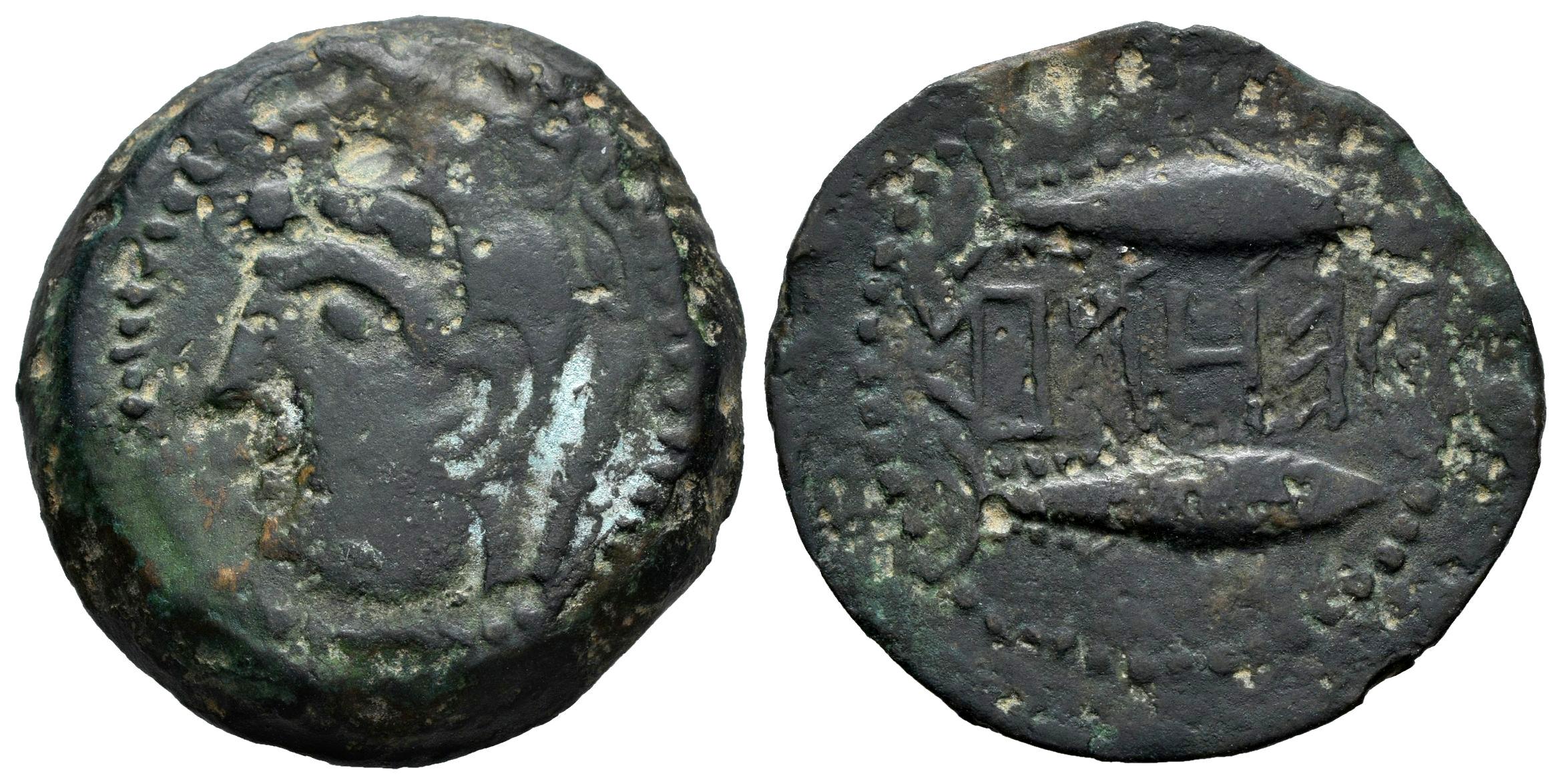 Ketovion. Unit. 150-50 BC. Alcácer do Sal (Portugal). (Abh-1625). (Acip-969). (C-1). Anv.: Head of Melkart left with lion skin, club behind. Rev.: Two tunny right, iberian legend KETOVION in between. Ae. 13,25 g. Rare. Choice VF. Est...300,00.
