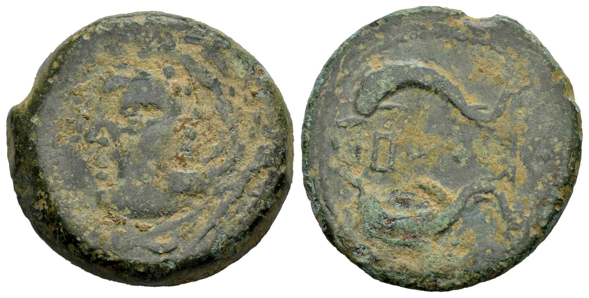 Ketovion. Unit. 150-50 BC. Alcácer do Sal (Portugal). (Abh-1629). (Acip-980). (CC-3051, plate coin). Anv.: Head of Melkart left with lion skin, club behind, legend (ANDVGEP. SISCU F). Rev.: Two dolphins left, iberian legend BEUIBUN partially visible. Ae. 11,12 g. Greenish patina. Very rare. Ex Jesús Vico (7/11/2019), lot 136. Ex Cores Collection. Ex Áureo (4/26/1994), lot 381. F/Choice F. Est...300,00.