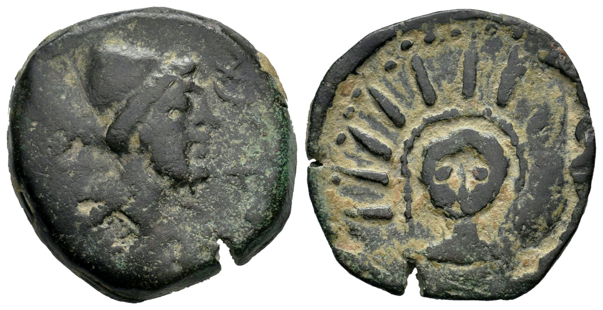 Malaka. Unit. 200-20 BC. Malaga. (Abh-1726). (MIB-10/15). Anv.: Head of Vulcan right, tongs behind, punic legend before. Rev.: Head of Helios facing. Ae. 11,14 g. Almost VF/VF. Est...100,00.