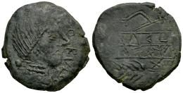 Obulco. Unit. 220-20 BC. Porcuna (Jaén). (Abh-1789). (Acip-2194). Anv.: Female head right, OBVLOC before. Rev.: Plow left, ear of corn below, iberian legend ORCAILV/NTUSTULDUKO left, in between. Ae. 11,05 g. Almost VF. Est...70,00.