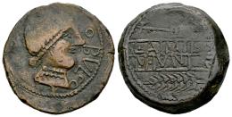Obulco. Unit. 220-20 BC. Porcuna (Jaén). (Abh-1807). (MIB-159/26a). (Acip-2222). Anv.: Female head right, OBVLCO before. Rev.: Plow right above, ear of corn left below; between them, legend L. AIMIL/M. IVNI/AID. Ae. 17,86 g. VF. Est...120,00.