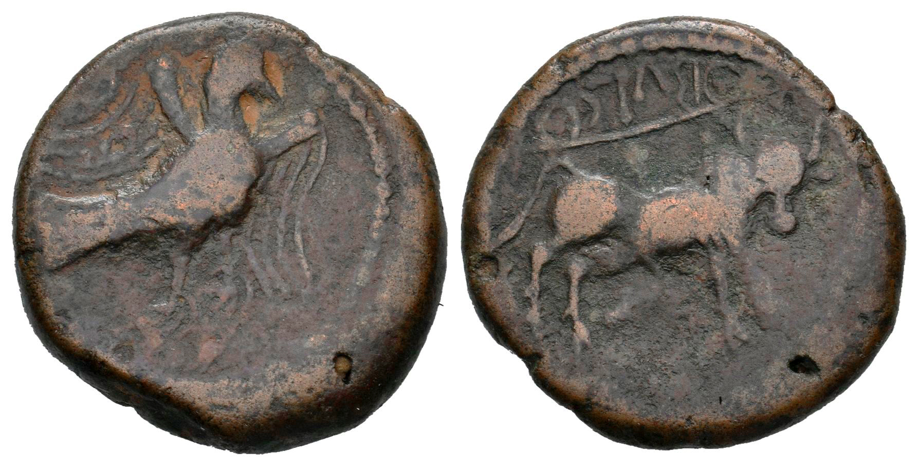 Obulco. Half unit. 220-20 BC. Porcuna (Jaén). (Abh-1848). (MIB-159/15b). (Acip-2240). Anv.: Eagle right. Rev.: Bull right, legend OBVLCO from right to left. Ae. 7,81 g. Scarce. Almost VF. Est...80,00.