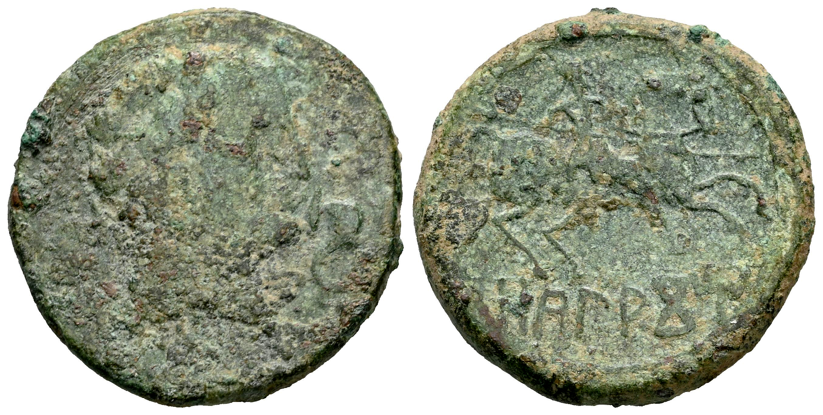Okalakom. Unit. 120-20 BC. Zona de Navarra-Aragón. (Abh-1860). (MIB-139/1b). Anv.: Male head right between dolphins. Rev.: Horseman right, holding spear, iberian legend OKALAKOM below. Ae. 7,21 g. Rare. Almost F/Choice F. Est...110,00.