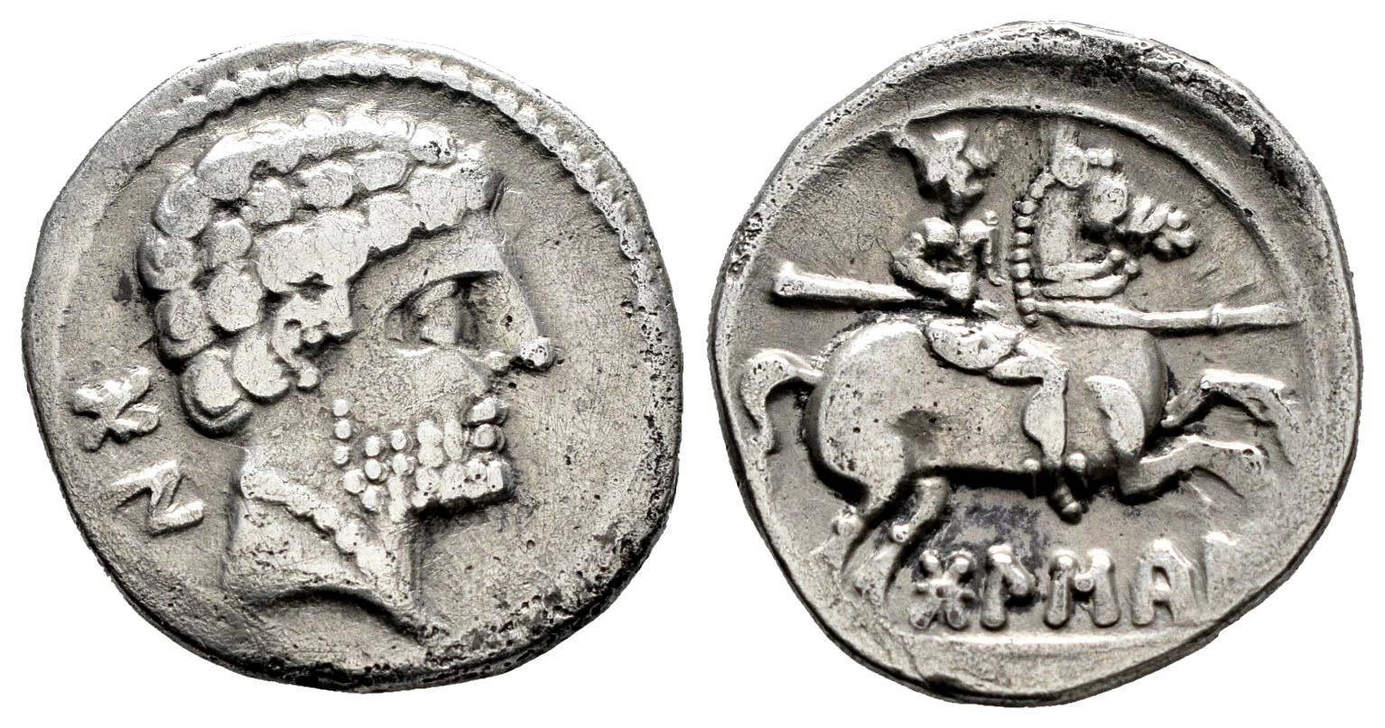 Bolskan. Denarius. 180-20 BC. Huesca. (Abh-1911). (MIB-79/07a). Anv.: Bearded head right, iberian letters BON behind. Rev.: Horseman right, holding spear, iberian legend BOLSKAN below. Ag. 3,71 g. Slight porosities. Almost VF/VF. Est...100,00.