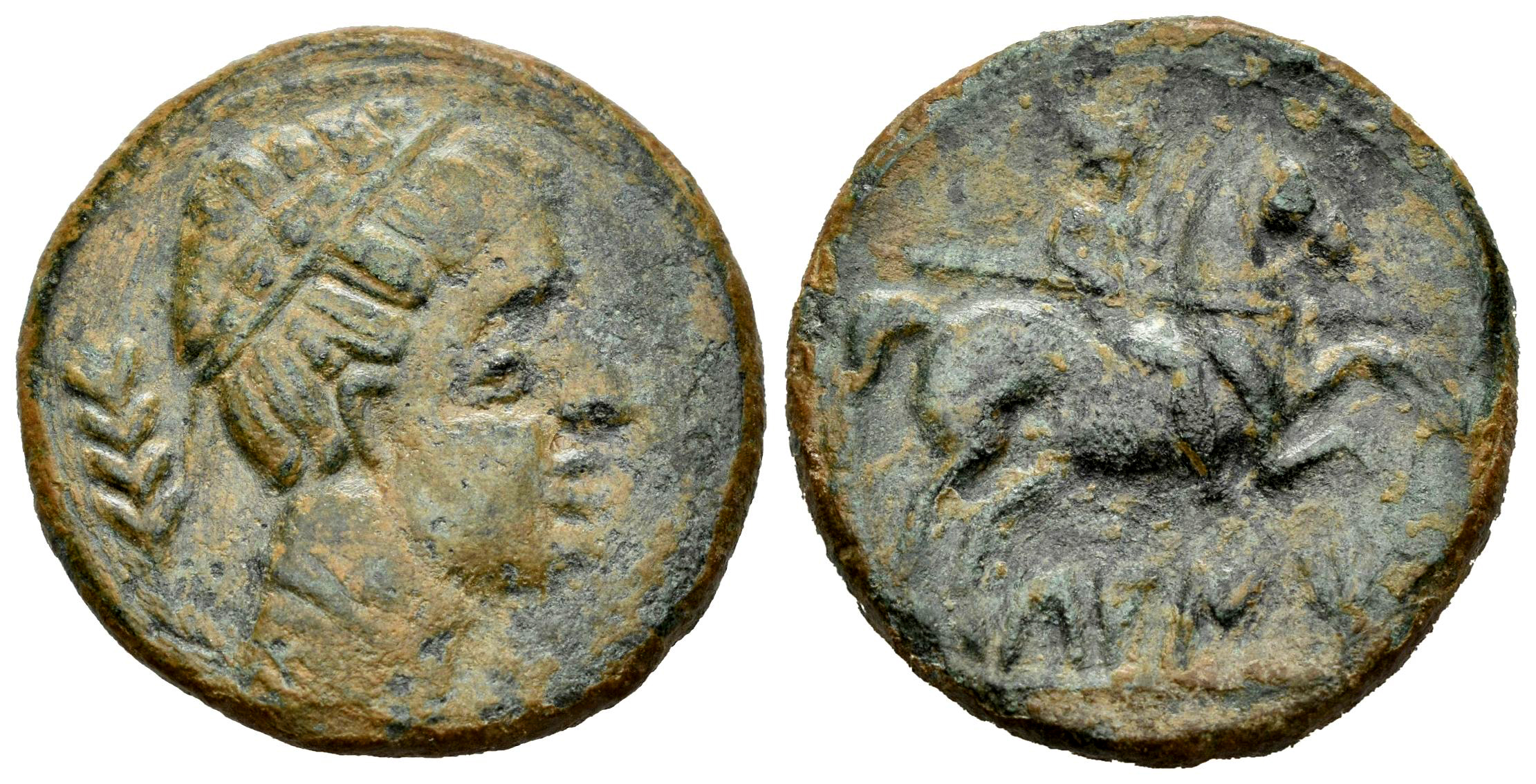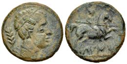 Saiti-Saetabi. Unit. 120-20 BC. Xátiva (Valencia). (Abh-2100). (MIB-30/05). (Acip-2031). Anv.: Diademed male head right, ear of corn behind. Rev.: Horseman right, holding spear, iberian legend SAITI below. Ae. 12,59 g. VF/Almost VF. Est...120,00.