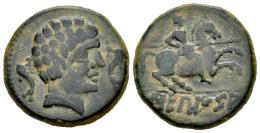 Sekaisa. Unit. 120-20 BC. Area of Aragon. (Abh-2131). (Acip-1562). Anv.: Male head right between two dolphins. Rev.: Horseman right, holding spear, iberian legend SEKAISA in exergue. Ae. 8,67 g. VF. Est...90,00.