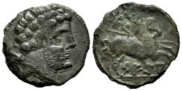 Sekia. Unit. 120-20 BC. Ejea de los Caballeros (Zaragoza). (Abh-2159). (Acip-1449). (C-9). Anv.: Bearded head right, dolphin behind. Rev.: Horseman right, holding spear, star above, iberian legend SEGIA below. Ae. 6,30 g. Almost VF. Est...90,00.